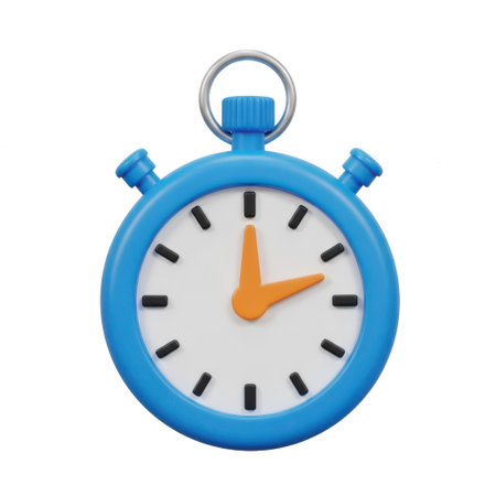 A 3D rendered image of a blue stopwatch with orange hands, featuring a white face and black tick marks, set against a plain background.