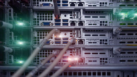 Hosting platform for modern Internet resources. Rack with server data storage equipment. Many network cables are connected to the data center equipmen