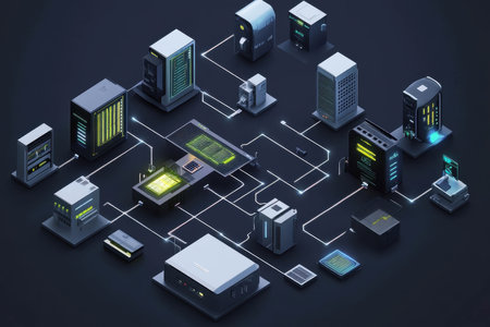 A vibrant digital landscape depicts various servers and data processing units interconnected by glowing lines. This visualization highlights the complexity of modern networks.