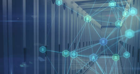 Digital composite image of Network of connections green icons and data processing against server room. Global networking and online security concept
