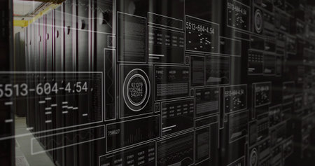 Overlaying HUD panels across data center corridor, showing server racks, yellow cable tray. Cabinets, aisle, translucent, overlay, dashboard, interface, numbers