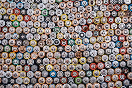 Many used AA electric batteries, lined up upright and viewed from above. Concepts of energy waste and battery recycling