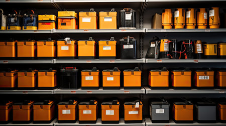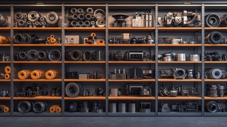 A spacious industrial storage area showcases neatly organized shelves filled with a variety of mechanical parts and equipment, highlighting efficiency and practicality.
