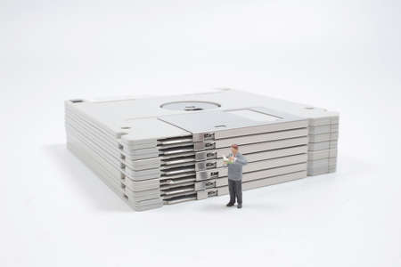 Whole plane with white background of stack of colored floppy disks, grey, black and blue.