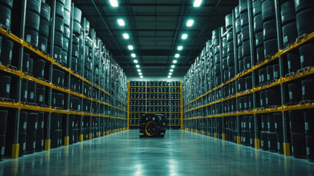 Inside a futuristic warehouse, equipment in a row, illuminated brightly generated by artificial intelligence
