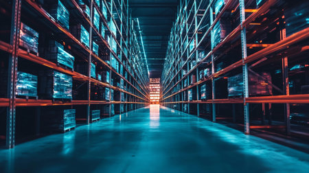 A futuristic warehouse with shelves filled with stacked goods, illuminated by blue and orange glowing lights, symbolizing logistics, technology, and modern storage.