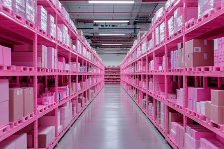 Vibrant warehouse aisle with pink shelving units stacked with colorful boxes for storage
