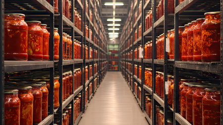 A vibrant display of glass jars filled with rich red tomato sauce, neatly arranged on metal shelves in a well-organized storage facility, showcasing abundance.