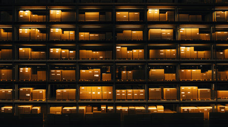 A contemporary warehouse interior featuring neatly arranged cargo containers in a well-lit environment, emphasizing organization and efficiency in storage.