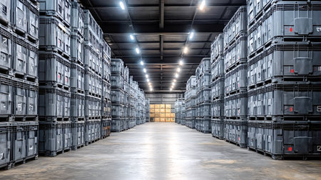 Warehouse aisle extending into the distance, showing tall stacks of gray plastic reusable shipping containers, symbolizing efficient logistics, storage, and supply chain management