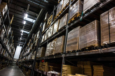 Big warehouse storage room with boxes and shelves