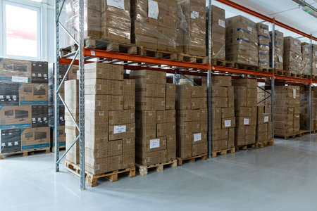 Interior of the new and modern warehouse space in a well lit large room Rows of shelves with boxes