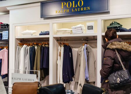 Strasbourg, France - Dec 27, 2017: Man walking near shopping stall inside the Galeries lafayette mall with logotype of Polo by Ralph Lauren brand
