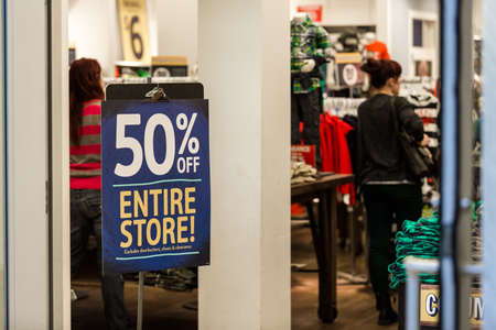 Sale at a clothing store. Red posters with the word Sale at the entrance to the mall.