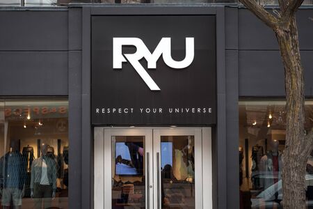 TORONTO, CANADA - NOVEMBER 13, 2018: Ryu Store logo in front of their shop in Toronto. Ryu, or Respect Your Universe, is a Canadian Urban Atheltic Apparel and sportswear spread in America