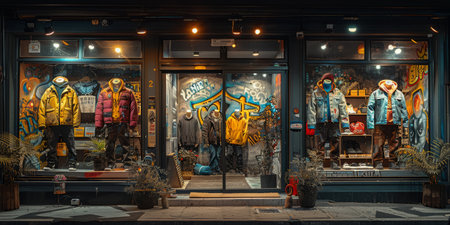 Trendy urban fashion boutique with a bold graffiti backdrop, featuring mannequins dressed in stylish streetwear, denim jackets.