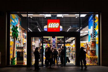 Barcelona, Spain - November 25, 2025: Lego shop, known for the manufacture of Lego-brand toys, consisting mostly of interlocking plastic bricks, with people around at night in a shopping street of Barcelona, Catalonia, Spain