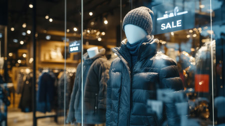 Mannequins in winter coats displayed behind frosted glass in a clothing store, with a prominent sale sign and elegant lighting