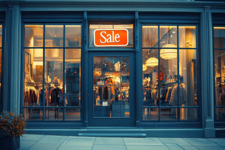 A store front with a sign that says Sale. The store is open at night. The inside of the store is lit up and has a lot of clothes on display