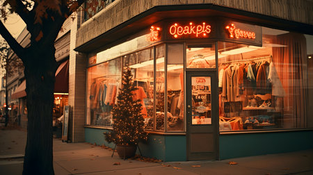Cozy boutique storefront with a warm lighting, vintage-inspired fashion, and stylish mannequins.