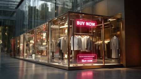 A sleek modern retail storefront showcases stylish clothing with vibrant signage encouraging customers to buy now, creating an inviting shopping atmosphere.