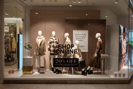 H&M shop at Emquartier, Bangkok, Thailand, Sept 20, 2019 : Fashionable brand window display. Standing group models in variety clothing style showcase at the store.
