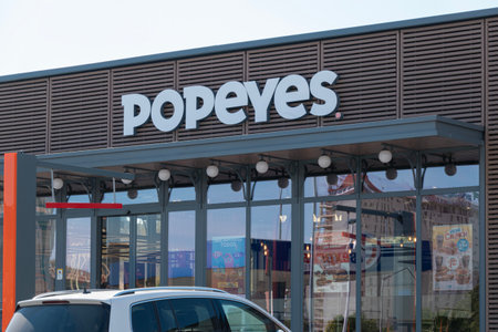 Finestrat, Spain - March 2, 2023: Popeyes logo sign on entrance of Popeyes fast food restaurant. Popeyes Louisiana Kitchen is American multinational chain of fried chicken fast food restaurants