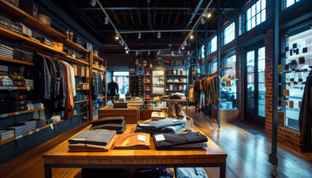 Modern clothing store interior with a stylish apparel displays, natural lighting, and spacious layout.