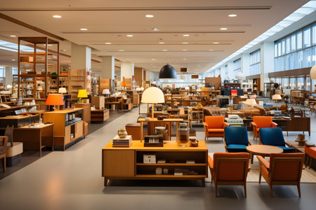 A store filled with lots of furniture and a chandelier. AI generative image.