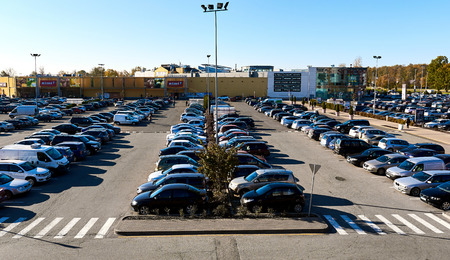 Riga, Latvia - October 17, 2016: Cars parked in a parking lot at shopping sentre Spice in Riga city. Northern Europe. Latvia