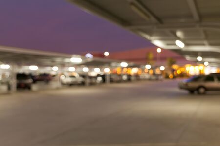 Blurred cars in car parking lot in shopping mall. Bokeh lights background. Abstract blur car parking lot for background. Blurred cars parking and bokeh light
