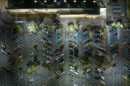 Aerial view of large parking lot in front shopping mall with many parked cars. Carpark at supermarket with lines and markings for vehicle places and directions