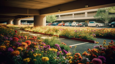 Future of parking. Automated parking systems, parking lots. Technology to re-invent urban spaces. Many Cars in the multi-storey parking lots. AI generative