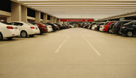 Modern underground parking with parked cars, illuminated by bright LED lights