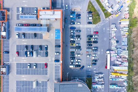Aerial view of a large number of cars of different brands and colors standing in a parking lot near the shopping center in a chaotic manner. Parking divided by white dividing strips and sidewalks