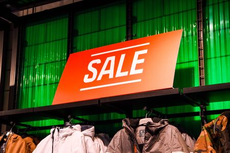 A sign with the inscription SALE in white on a red background in the trading floor of casual clothing store. Fashion concept, discount season, black friday, offline shopping, gimmicks, holiday sales.