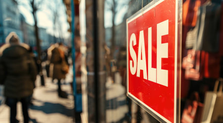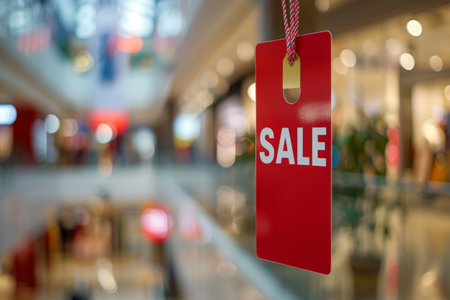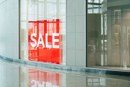 Red sale tag hanging on store window in busy shopping mall. Concept of retail discounts, promotions and seasonal sales