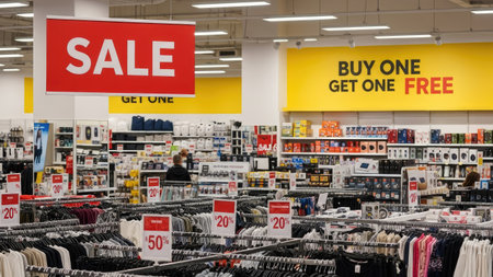 Bold Red Sale Banner in Retail Store Interior, Discount Promotion Signage