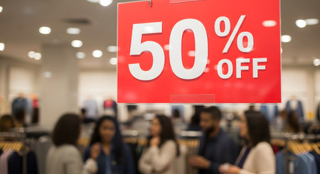 Vibrant red sale tag promotes discounts in a busy store with shoppers and merchandise in focus