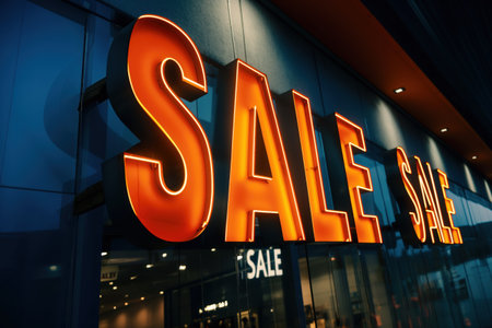 Large illuminated orange sign announcing sales on the windows of a shop, encouraging customers to take advantage of the discounts