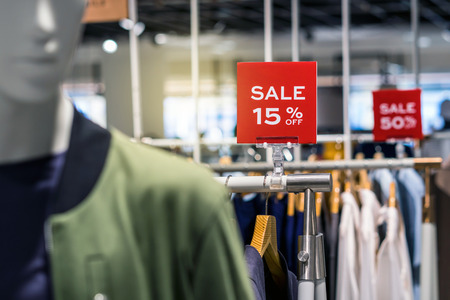Red sale sign discount on clothing rack in modern shopping mall or department store with copy space. Retail shop promotional event, new product discount, or business marketing advertising concept