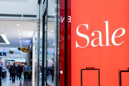 Sale in a clothing store. Red sign saying Sale inside the store, blurred background. Product discount, black friday concept