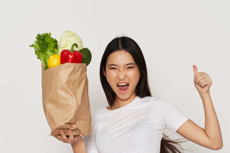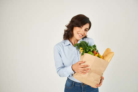 pretty woman package with groceries vegetables delivery supermarket close up