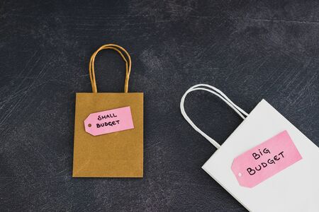 big vs small budget conceptual still-life, different size shopping bags with text on price tags