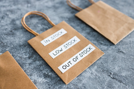 In stock, low stock and out of stock texts on top of shopping bags, concept of supply chain shortages and delays after the covid-19 global pandemic