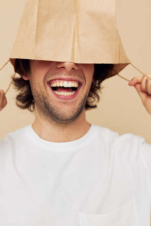 man in a white T-shirt with paper bag beige background