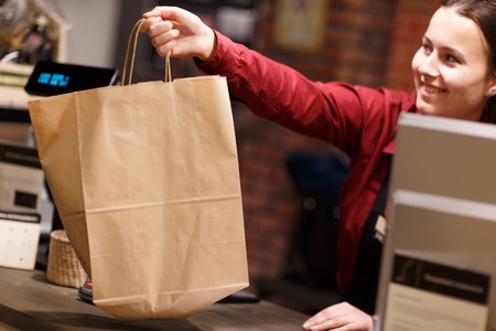 Female seller delivers paper bag with purchase .