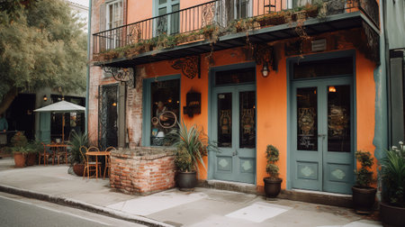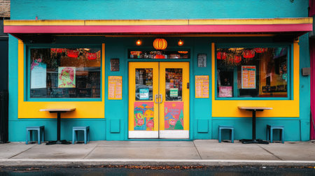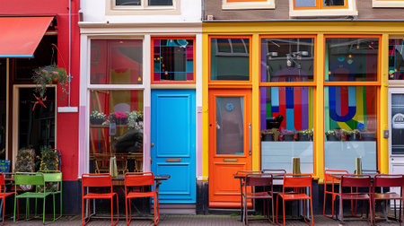 Facade of a colorful house, entrance to a cafe in a European country.