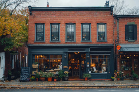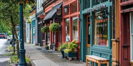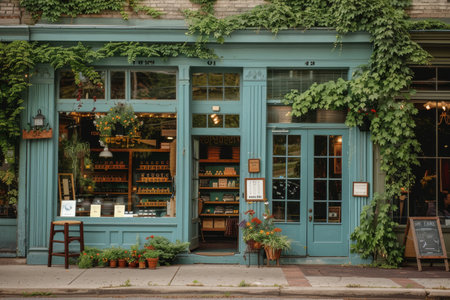 Numerous green plants growing on the storefront of a charming building in a historic downtown district, A charming storefront in a historic downtown district