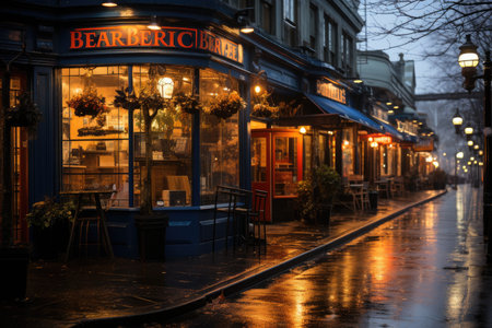 Gentle glow of lights welcomes guests to an inviting cafe on a lively city street.